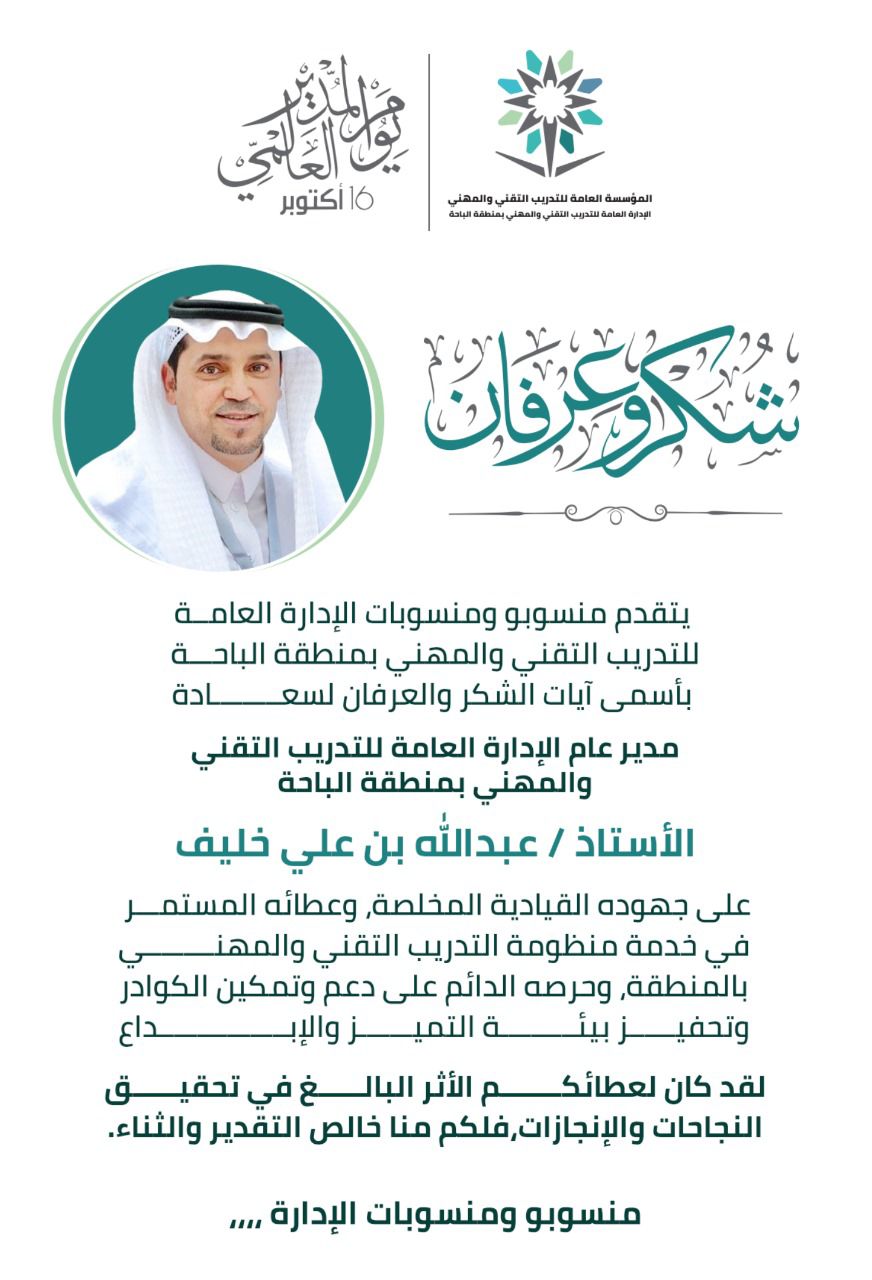 احتفت المنشآت التدريبية بمنطقة الباحة‬ بتفعيل يوم_المدير_العالمي‬ وذلك بتكريم سعادة مدير عام الإدارة العامة لـ التدريب_التقني‬ والمهني بالمنطقة الأستاذ: عبدالله بن علي خليف، تقديراً لجهوده القيادية المتميزة ودعمه المستمر لمسيرة التدريب التقني والمهني في
