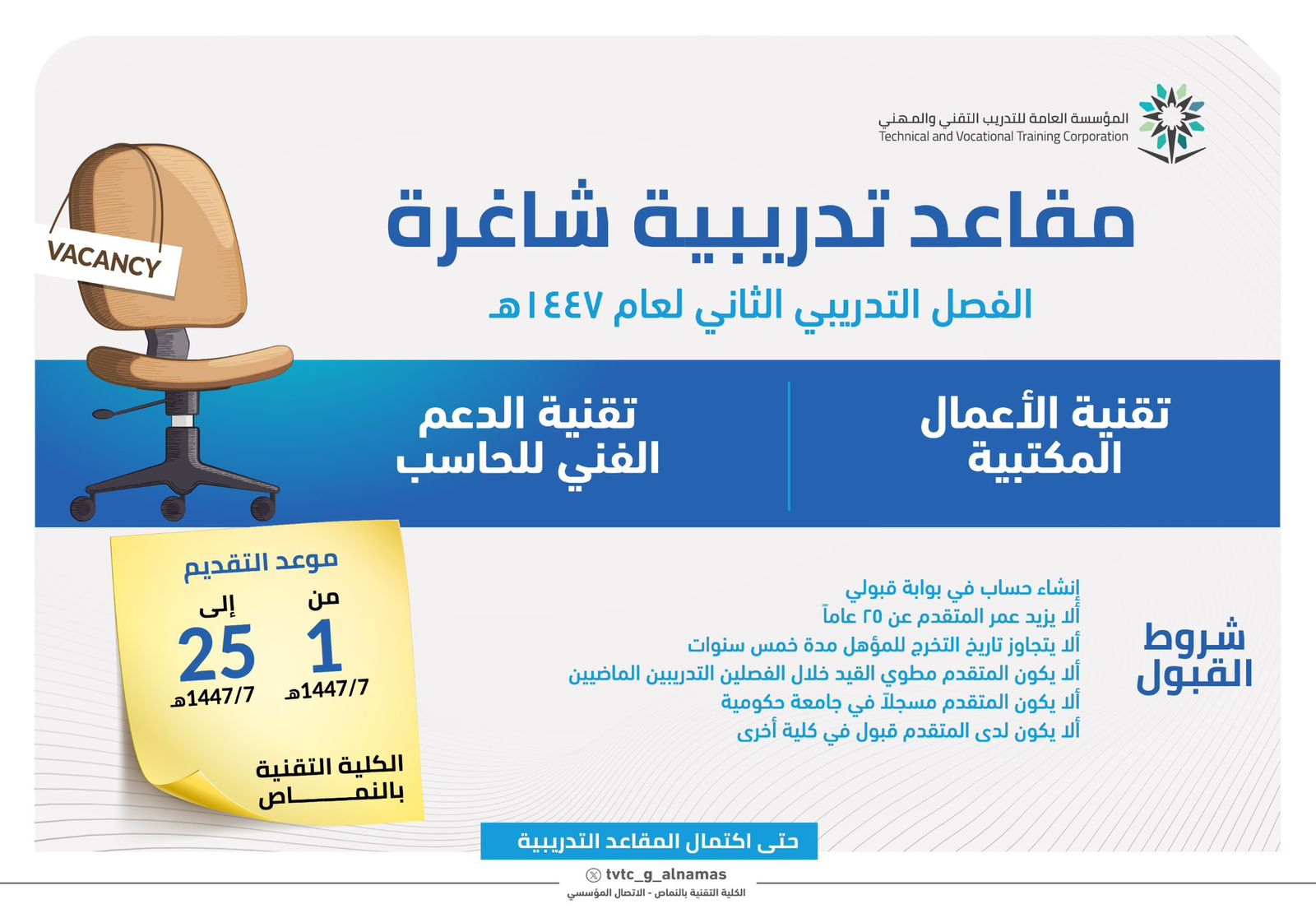 تعلن الكلية التقنية بالنماص عن توفر مقاعد تدريبية شاغرة للفصل التدريبي الثاني لعام 1447هـ في التخصصات التالية: