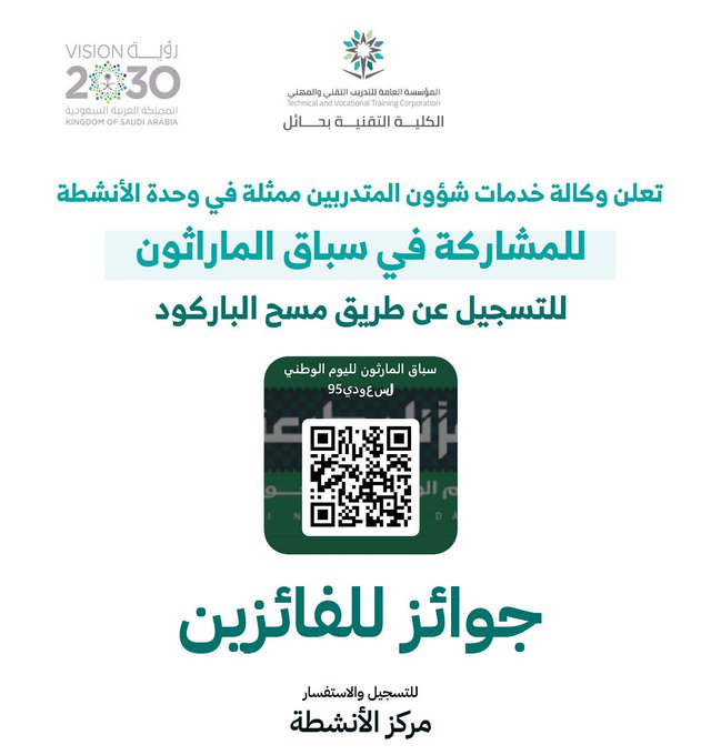 تعلن وكالة شؤون المتدربين في #الكلية_التقنية_بحائل ممثلة بوحدة الأنشطة عن إقامة ( سباق الماراثون ) وللراغبين بالمشاركة نرجو التسجيل بالباركود ادناة.