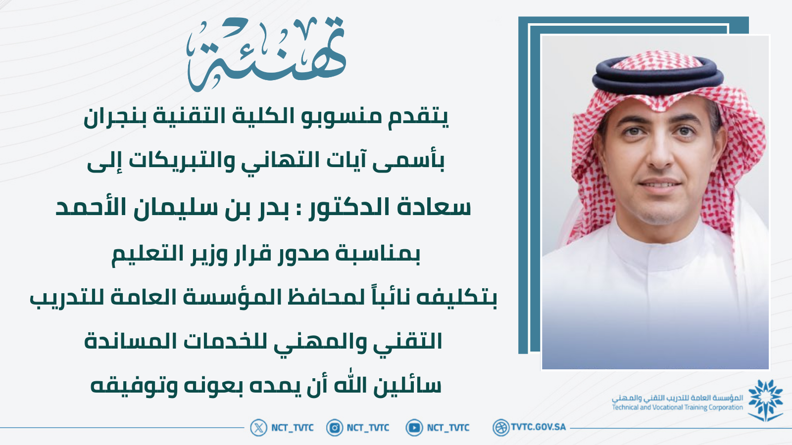 تهنئة | بمناسبة صدور قرار تكليف الدكتور بدر بن سليمان الأحمد نائباً للمحافظ ..