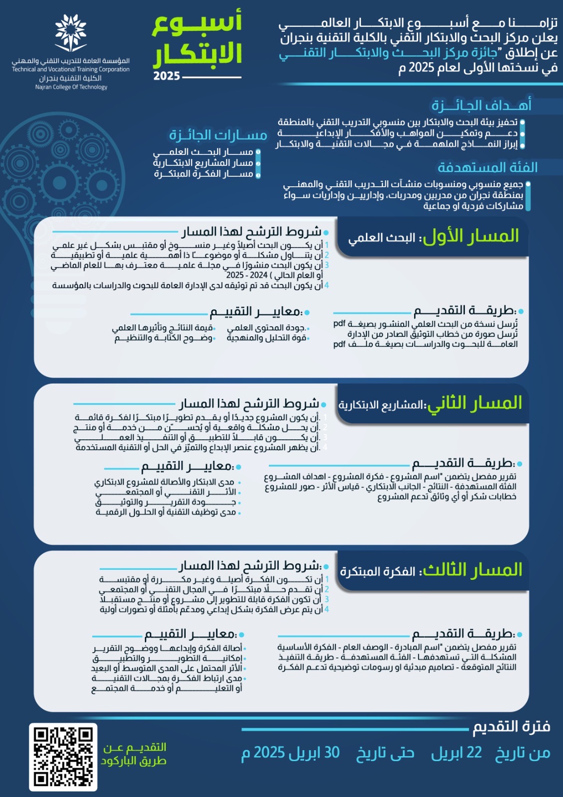 أطلقت الكلية التقنية بمنطقة نجران ممثلةً بمركز البحث والابتكار، أمس، تزامنًا مع أسبوع الابتكار العالمي، النسخة الأولى من جائزة "البحث والابتكار التقني 2025"؛ لتعزيز بيئة البحث والابتكار بين منسوبي ومنسوبات منشآت التدريب التقني والمهني.