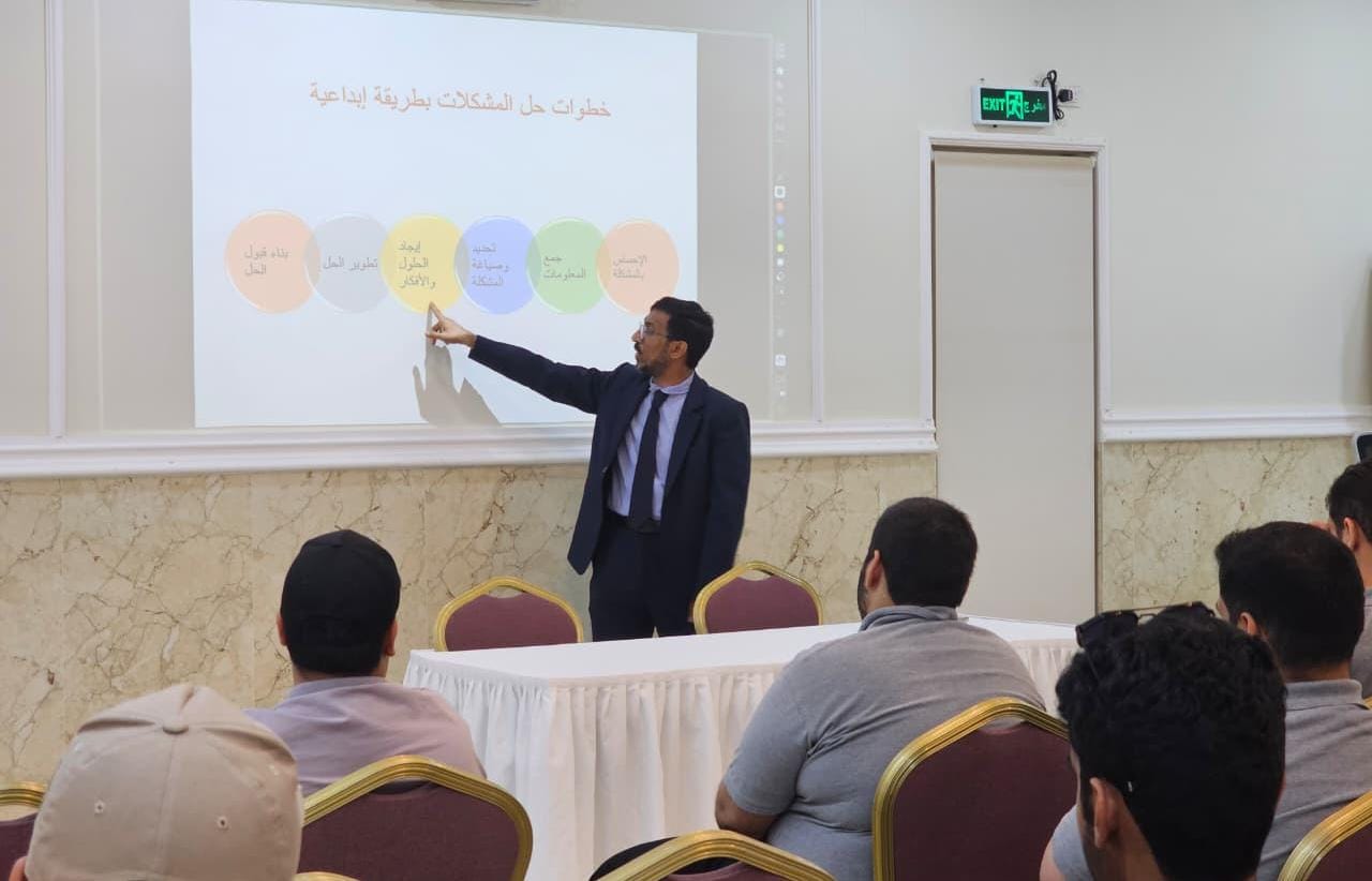 تحت عنوان " فكر وابتكر " قدمها وكيل الجودة بالكلية هاني الشيخ ، وتهدف لتزويد المتدربين ببعض المهارات التي تساعدهم في تطوير قدراتهم وتحفزهم على الابداع والابتكار.