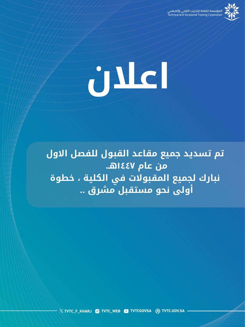 بكل فخر نبارك للمقبولات في #الكلية_التقنية_للبنات_بالخرج الفصل التدريبي الأول من عام ١٤٤٧هـ.