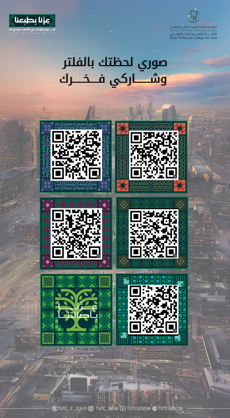 شاركينا فرحتنا في اليوم الوطني ،حيث قدم تخصص تقنية الوسائط المتعددة وتقنيات الويب لمسة الابداعية في حب الوطن ،من خلال فلاتر صمتتها المتدربة /ريما الفهيد ،لتوثيق لحظات الاحتفال وابراز روح الانتماء والولاء .