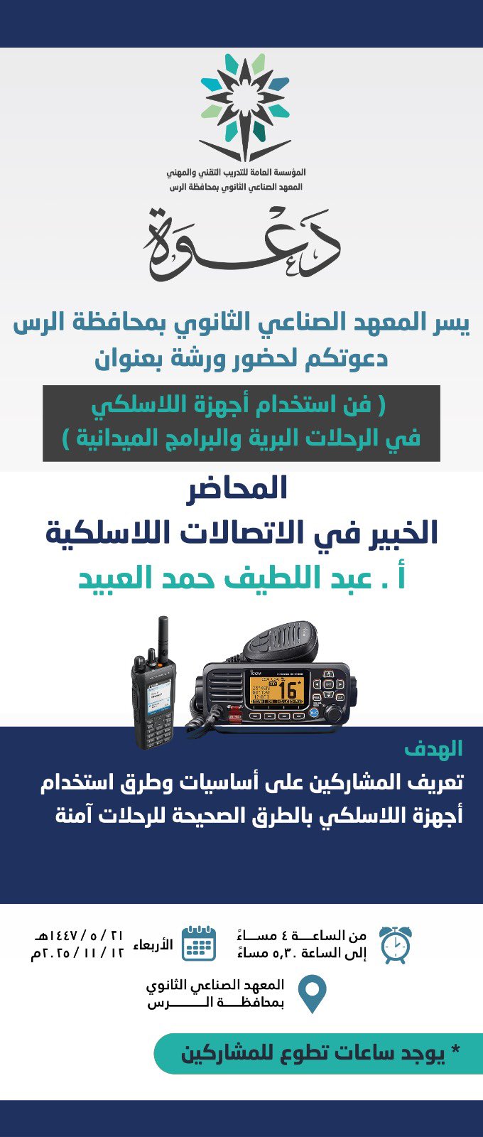 ​يسر المعهد الصناعي الثانوي بالرس دعوتكم لحضور ورشة تدريبية بعنوان: فن إستخدام أجهزة اللاسلكي في الرحلات البرية والبرامج الميدانية يقدّمها: الخبير في الإتصالات اللاسلكية أ / عبداللطيف بن حمد العبيد ( الدعوة عامة)